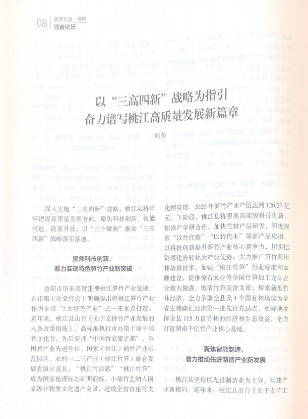 11月15日,最具影响力的中央级权威媒体之一新华社刊载了县委书记向荣的署名文章《以“三高四新”战略为指引 奋力谱写桃江高质量发展新篇章》,文章深刻阐述了桃江立足本地资源,壮大特色产业,推动“三高四新”战略在桃江落地落实。全文如下: