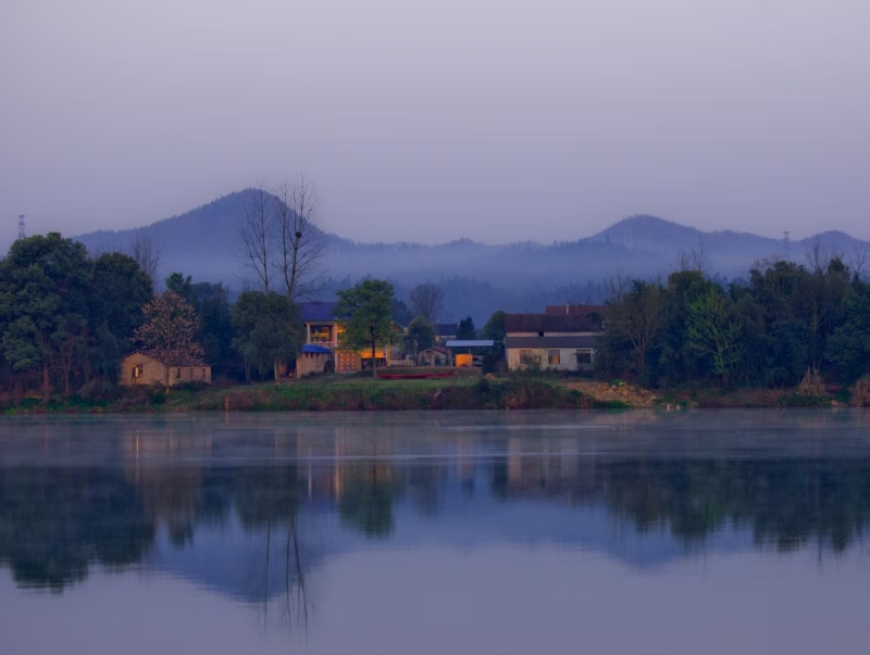 清晨的洋泉湾浸着薄雾,山水与白墙黛瓦的屋舍静卧如镜水面,竹影在涟漪里晃出细碎光斑。波纹漫过岸边青苔,时光在静谧中缓缓舒展,只余留白般的安宁。
