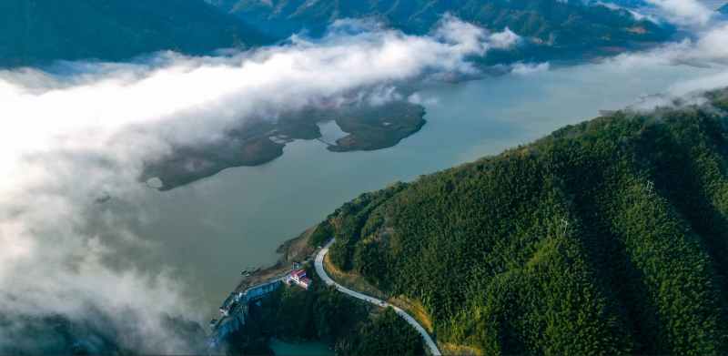 摄影师镜头下的桃花湖风景区,云雾缭绕于湖面与山峦间,湖水静谧神秘。岸边青山绿植满覆,公路蜿蜒伸展,尽显自然清幽之美。