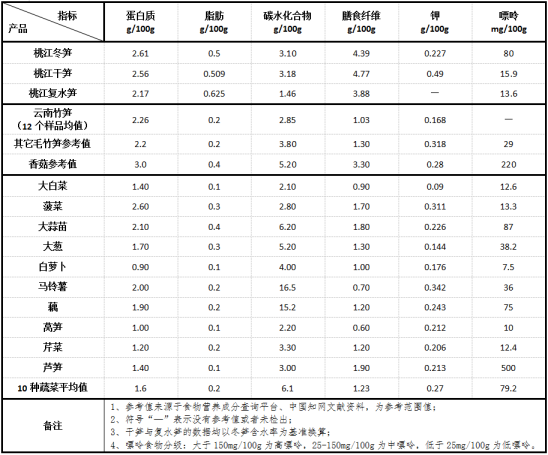 通过数据比对,桃江干笋、复水笋的蛋白质、脂肪、膳食纤维含量与鲜笋相当。值得一提的是,桃江干笋和复水笋中的嘌呤数值有了较大幅度降低,按照嘌呤食物分级标准,大于150mg/100g为高嘌呤,25-150mg/100g为中嘌呤,低于25mg/100g为低嘌呤。经过压榨、复水等工艺加工后,干笋和复水笋从中嘌呤标准(80mg/100g)降到了低嘌呤标准(干笋15.9mg/100g、复水笋13.6mg/100g),与大白菜、菠菜、莴笋、芹菜相当。