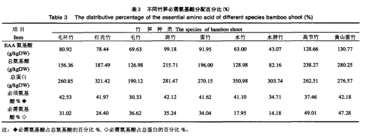 竹笋中的人体必需7种氨基酸(色氨酸未检测)含量均超过其氨基酸总量的30%以上,(联合国粮农组织规定8种人体必需氨基酸的比例为:亮氨酸17.2%、异亮氨酸12.9%、缬氨酸14.1%、赖氨酸12.5%、苏氨酸10%、蛋氨酸10.7%、苯丙氨酸19.5%、色氨酸3.1%)。占总氨基酸量的比率超过40%(国家标准)。