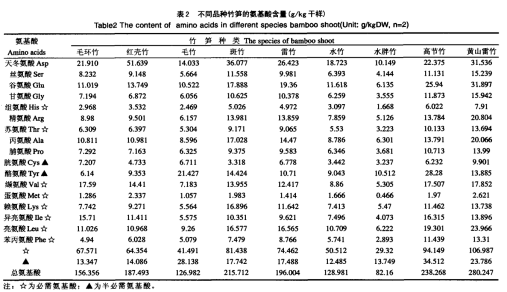 氨基酸是构成人体营养所需蛋白质的基本物质。人体中各种蛋白质都是由20种氨基酸按不同方式组合构成,其中有8种为人体不能自行合成或合成的速度远不能满足机体的需要,必须从外界通过食物摄取的氨基酸,称之为“必需氨基酸”。成人共8种:苏氨酸、缬氨酸、蛋氨酸、异亮氨酸、亮氨酸、苯丙氨酸、赖氨酸和色氨酸。(实验数据来源:安徽黄山学院资源与环境系徐圣友《不同品种竹笋蛋白质与氨基酸的分析与评价》)