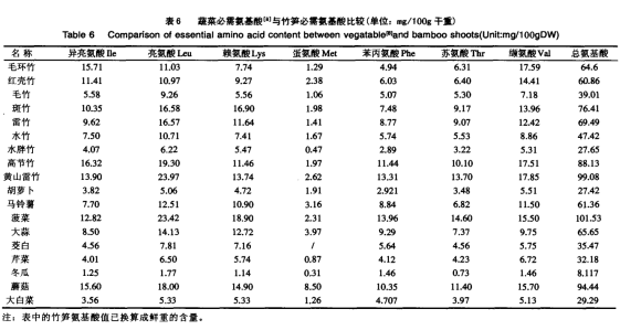 除菠菜、蘑菇、大蒜苗、大葱、马铃薯之外,竹笋的必需氨基酸总量高于其他蔬菜,因而竹笋营养价值优于多种常用蔬菜(大白菜、白萝卜、藕、莴笋、芹菜、芦笋、茭白、冬瓜)。(实验数据来源:云南西南林学院陈玉惠《l2种食用竹笋营养成分研究》;安徽黄山学院资源与环境系徐圣友《不同品种竹笋蛋白质与氨基酸的分析与评价》)