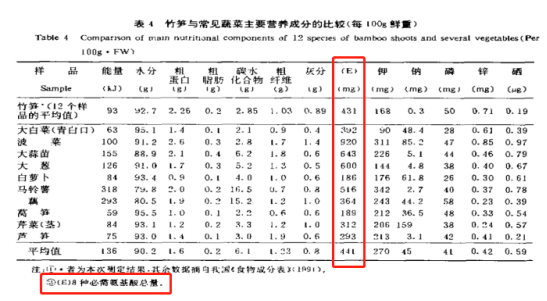 钾元素在人体中起调节心脏节律、维持血管弹性、促进肌肉和神经功能、调节水分平衡的作用。竹笋(冬笋)钾含量0.227g/100g,与大蒜苗、藕、莴笋、芹菜、芦笋和香菇含量相当,高于大白菜、大葱、白萝卜,仅低于菠菜和马铃薯。(竹笋中微量元素的高低取决于区域土壤环境微量元素含量)。