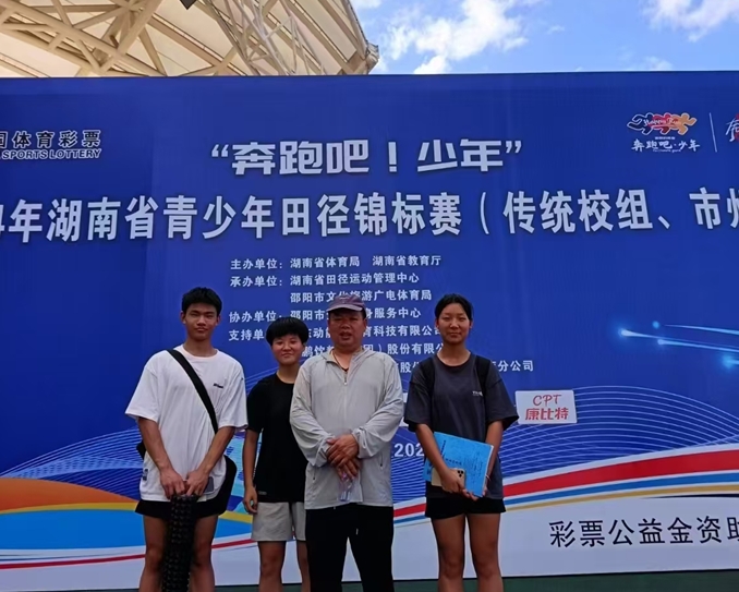 吴志军(左三)带领运动员参加2024年湖南省青少年田径锦标赛