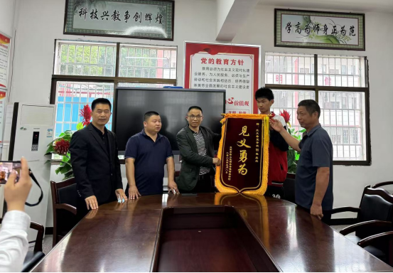 5月8日,益阳市赫山区谢林港镇谢林港村的雷先生和当地村委负责人一行专程来到桃花江镇兰天希望学校,为该校185班学生吴杰送上一面“见义勇为”锦旗,以表达对他几天前英勇救人的感激之情。