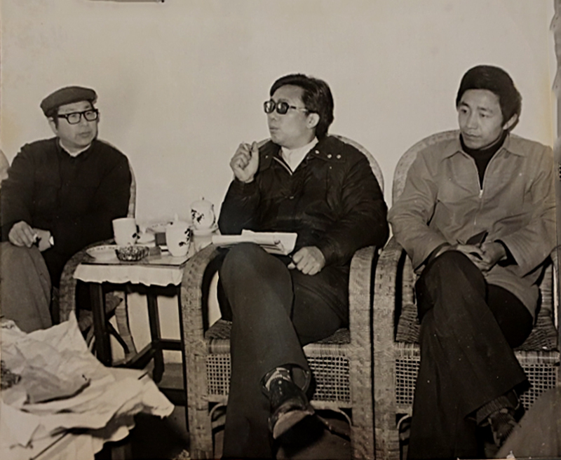 1983年,莫应丰(中)与符汇河(左)、郭辉(右)在县文化馆交流写作心得 李雪冰