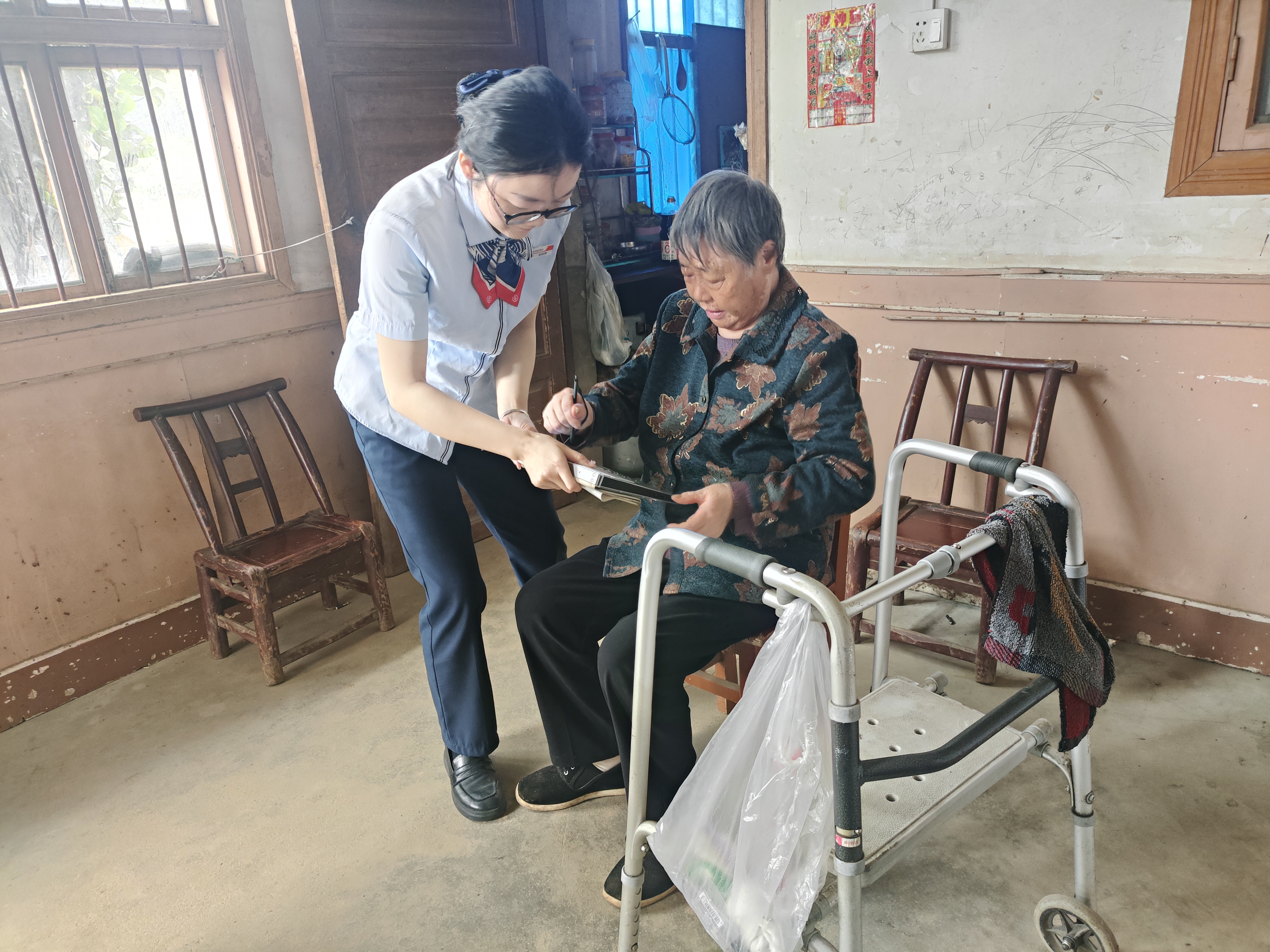 近日,桃江农商银行鲊埠支行接到陶公庙村福祥e站紧急求助:熊奶奶等3名村民因社保卡芯片损坏,已近一年未能领取养老金。面对老人年迈体弱、行动不便的困境,该支行迅速组建金融服务小分队,携带移动制卡设备开展上门服务,将柜台“搬”进农家院落,为银发群体打通金融服务“最后一米”。