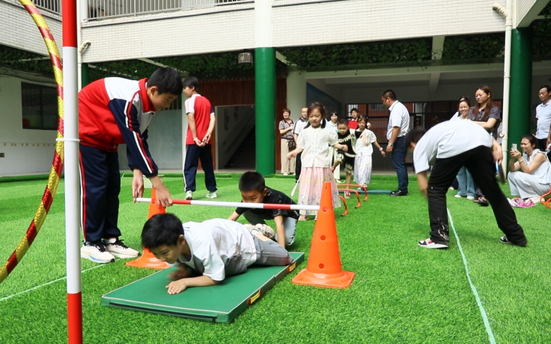 小朋友们玩“过障碍”游戏 莫斌 摄