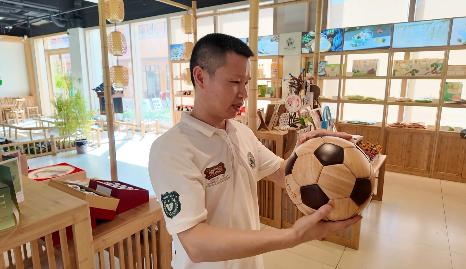 游客贺先生边把玩“竹”球边表示:“这个足球我开始以为是真足球,摸了才发现是竹板做的,这个纹路非常细腻,比皮具做的还要好。”