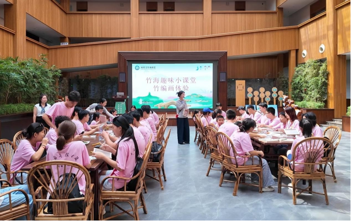 在竹文化博览馆中厅,专业老师为孩子们传授竹编画技艺,详解制作方法与技巧。孩子们动手创作,发挥想象,将龙、兔子等形象及“福”“平安喜乐”字样融入作品,让竹元素焕发创意光彩。