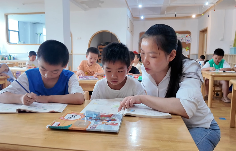 暑托班老师辅导孩子们完成作业 莫非易 摄