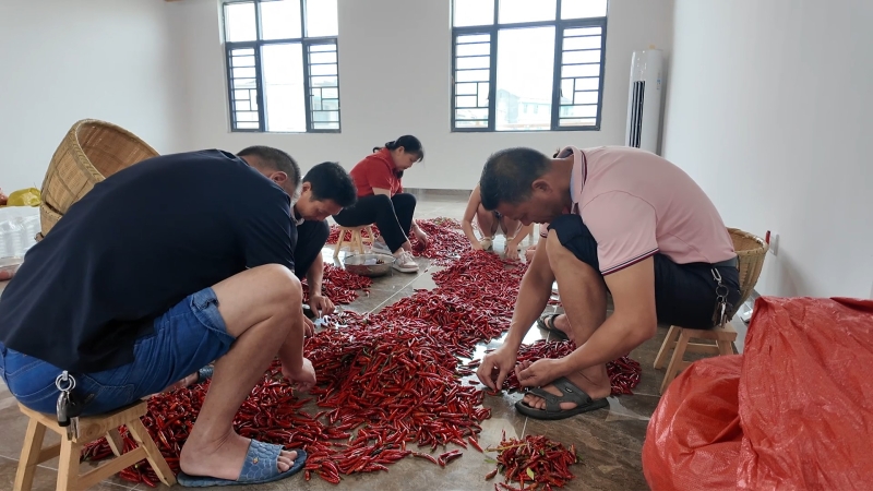 村民正在分拣刚摘回来的朝天椒 刘蓉 摄