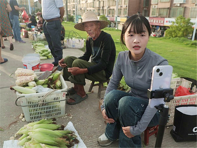 刘梦骊在为老菜农做直播卖菜 陈明 摄