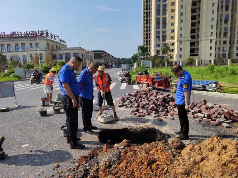 7月30日,县城管局市政设施管理站接市民群众电话,位于县城区文明路农商城入口处有一处路面因检查井破损以及暴雨冲刷造成塌陷,形成面积3平方米的深坑,存在较大安全隐患。市政设施站迅速组织人员到达现场,对塌陷路段进行现场勘察,对风险点采用了围挡封闭。随后设施站组织对该路面进行开挖抢修。维修人员对已损坏的检查井井壁清理基面并凿除破损部分,用混凝土填补砌砖修复。对形成的深坑重新铺设水泥稳定碎石垫层、分层回填夯实并平整路面。从上午一直到夜晚8点多,经过10个多小时的连续奋战,完成了塌坑抢修任务,恢复了道路正常通行。