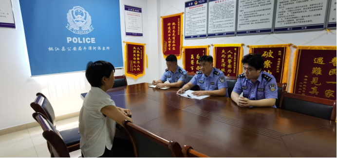 8月8日14时14分,牛潭河派出所接到反诈中心资金预警指令:桃花江镇牛潭河社区居民鲁女士疑似遭遇电信诈骗。所长杨宏达迅速行动,立即联系鲁女士,并带领辅警符文海、邹泽凡赶赴其工作单位,将她接回派出所了解详情。