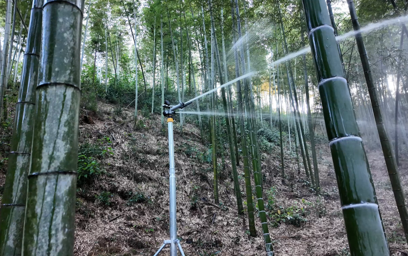 走进桃花江镇花果山村石子冲世林合作社小八三竹笋培育基地,只见一条条水管顺着竹林地势蜿蜒延伸,2米多高的喷水柱均匀分布其间,水雾弥漫中尽显生机。该基地负责人吴小平介绍,为破解竹林灌溉难题,基地共投入40万元用于灌溉设施建设,其中8万元正是桃江县林业局下拨的《湖南省竹产业高质量发展县》项目奖补资金。经过两个月紧张施工,150亩竹林已铺设水管1500余米、安装喷水柱近百个,实现灌溉全覆盖。吴小平说,在设施加持下,一是能有效抵御干旱,二是通过保持土壤湿润,促进笋芽的分化,提高竹笋和竹材的产量。预计竹林竹笋产量将在原有基础上提升50%。