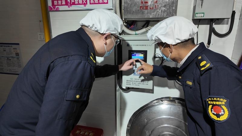该设备可24小时实时采集餐饮企业油烟排放浓度、净化设备运行状态等数据,通过互联网技术自动上传至监管平台。执法人员只需登录后台,即可实时查看各餐饮单位的排放情况。县城管执法大队四中队副中队长卢智凡告诉记者,过去检查油烟,他们要一家家跑,爬上爬下看净化器,费时费力。现在在手机软件上就能看到哪家店净化器没开、排放超标了。这让他们对违法行为进行“点对点”的精准监测,督促他们自觉、规范地使用净化设备。