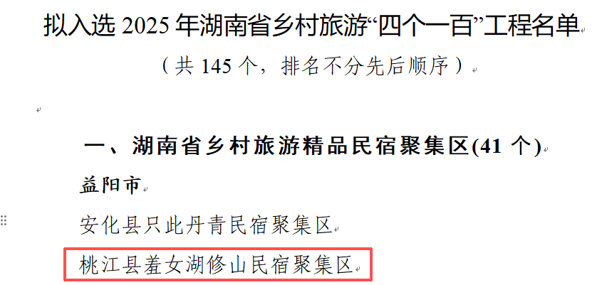 在重点村镇类别中,桃江县灰山港镇杨家湾村拟入选省级乡村旅游重点村。“四个一百”工程中,羞女湖修山民宿集聚区、桃花江镇崆峒村(精品村)和修山云栖羞湖廊道三个项目入围。此外,西峰寺乡村休闲旅游区和羞女湖莲盆嘴乡村休闲旅游区拟认定为省级五星级乡村旅游区(点)。