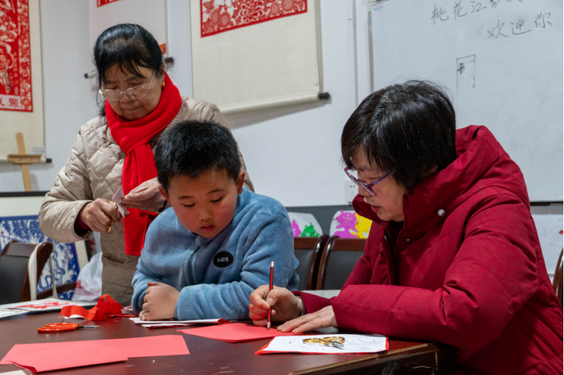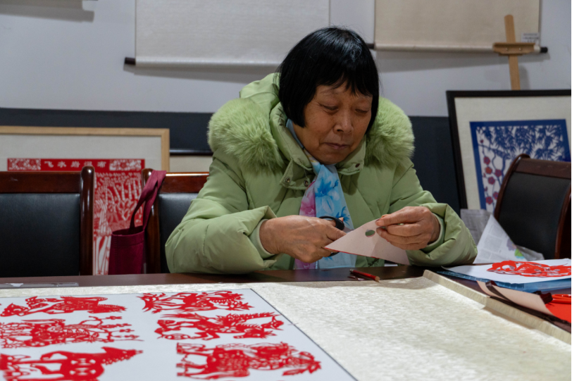 老中青三代剪纸艺人正在创作“百骏呈祥” 薛雅琴 摄
