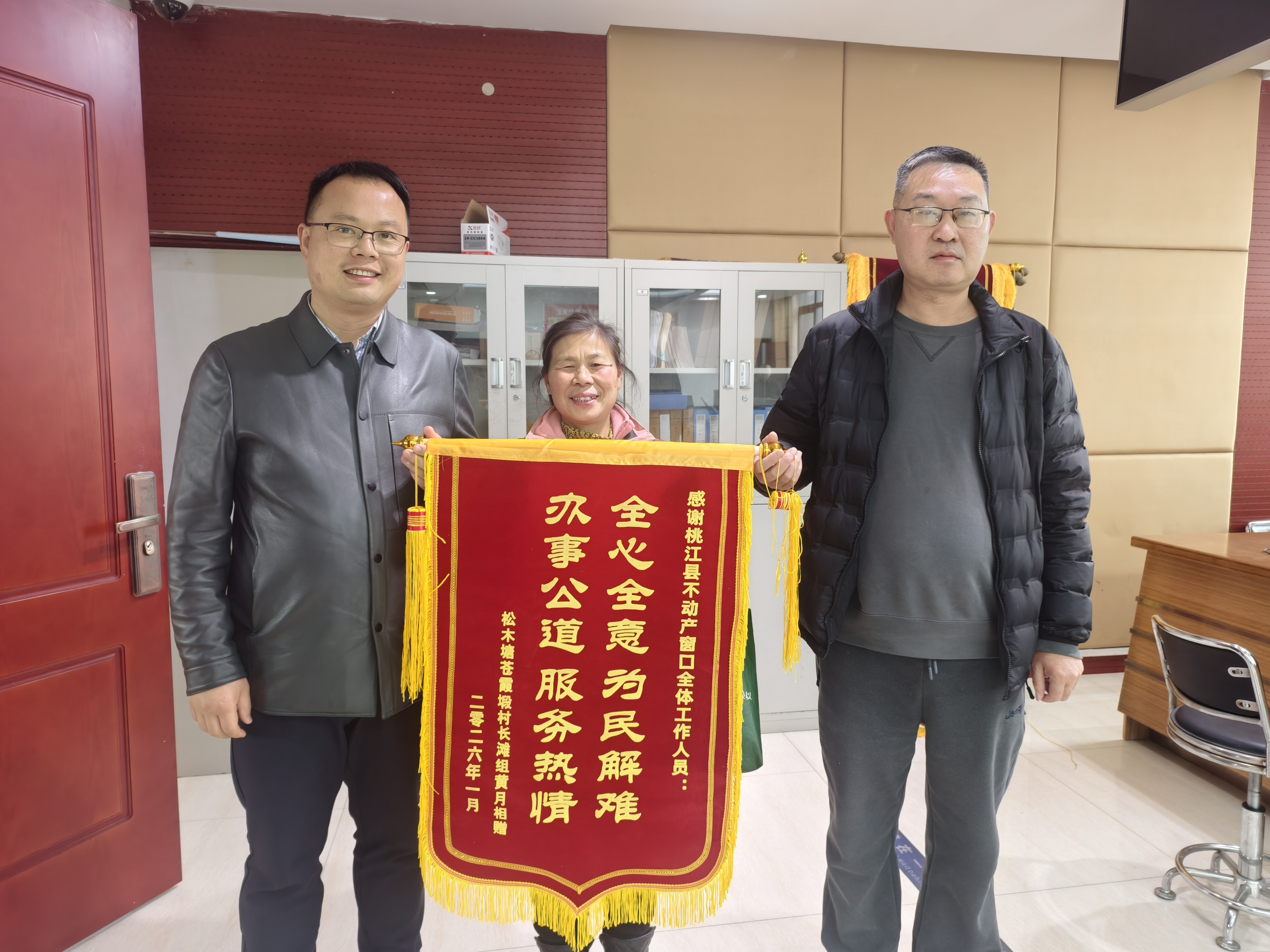 2月24日是春节假期结束后的首个工作日,一大早,松木塘镇苍霞塅村村民黄月相将一面印有“全心全意为民解难,办事公道服务热情”的锦旗送到桃江县不动产登记中心,对工作人员高效贴心为其办理宅基地不动产登记业务表示衷心感谢。