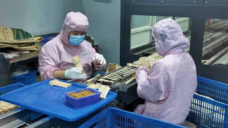 湖南竹腾环保科技有限公司工人们分拣竹制环保餐具 张益平 摄
