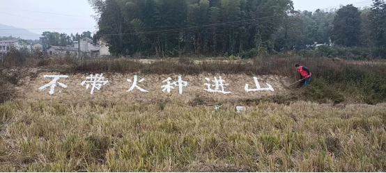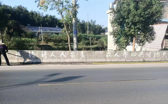 在该镇红金村,部分退休镇、村干部、老年协会成员发挥余热,主动在村辖区内山坡、田坎、墙壁上标画森林防火、禁烧秸秆宣传语。“退休不褪色,我们要积极响应党和政府的号召,以自己的方式贡献一份力量。”镇政府退休干部温桂生说。一幅幅石灰书写的宣传标语用通俗易懂的语言讲着森林防火的注意事项、秸秆焚烧的害处。深入田间地头,一手拿笔,一手拿石灰,将标语遍布村里显眼位置,把森林防火、秸秆禁烧的重要性传入每家每户。