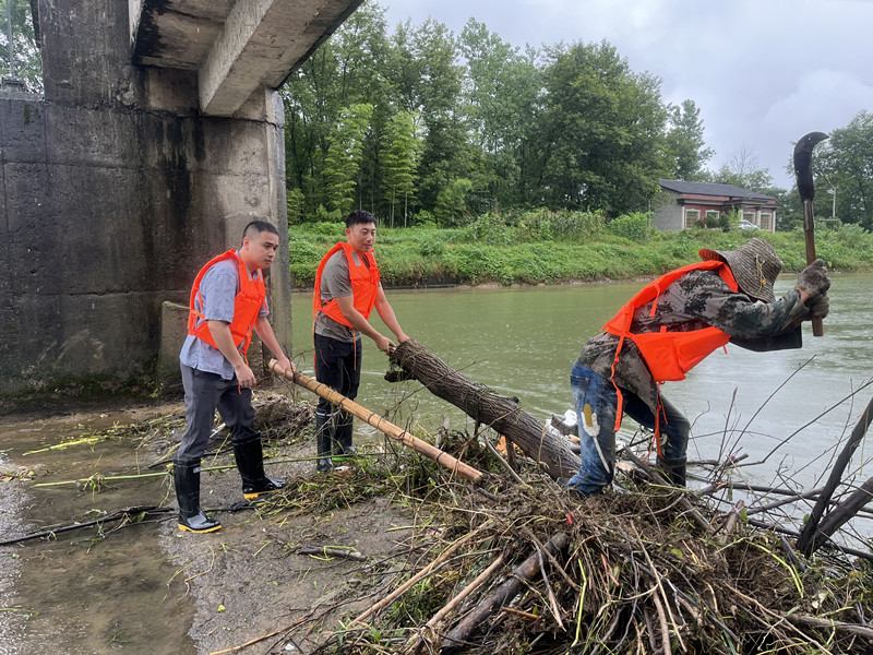 当日上午,镇党委委员、宣传委员刘育东在带队巡查时发现,跨沾溪河的永隆湾电坝桥墩间行洪道因上游暴雨冲刷,被大量树枝和杂物堵塞,总长度达9米,其中最大树枝直径超过30厘米。面对这一突发情况,巡查队迅速启动防汛应急预案,并立即组织了一支由巡查队队员、伍家洲村村干部和驻村工作队组成的清理队。