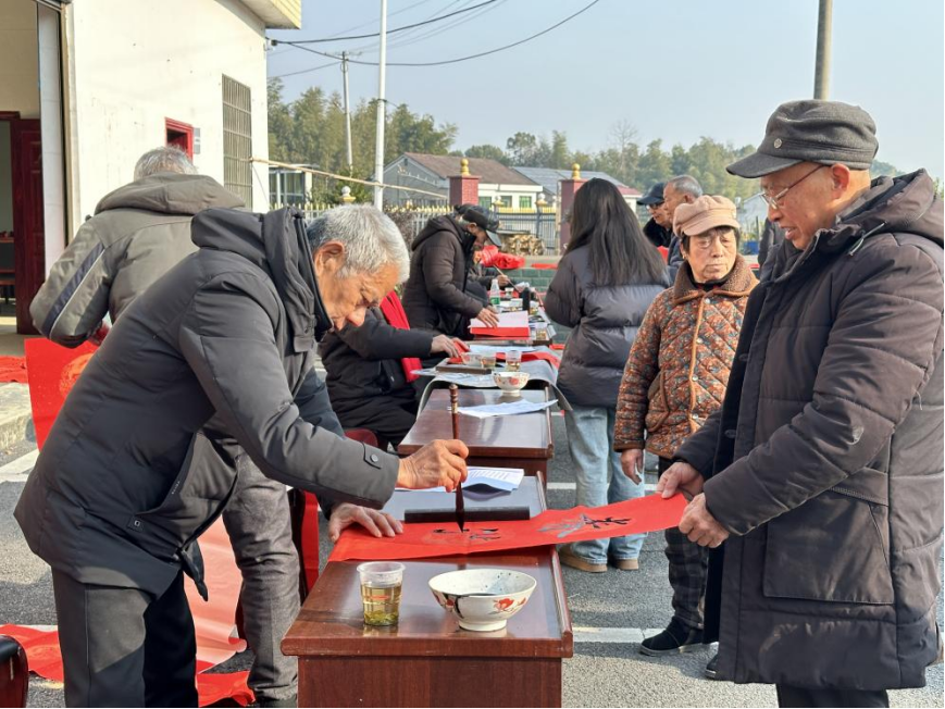 村民们闻讯而来驻足观看书法家们龙飞凤舞地写着每一个寓意美好的字,排队领取寓意着好运和幸福的春联。接过春联的村民们脸上洋溢着喜悦的笑容,仿佛接过了对新年好运和幸福的延续。整个村委会的院子都被红色春联装点得喜气洋洋。