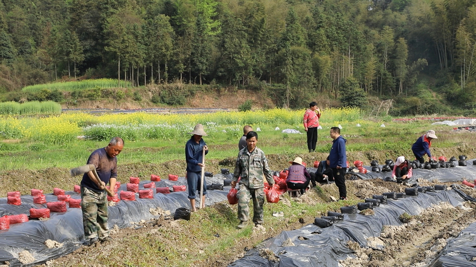 近日,在沾溪镇长田坊村的退役军人家庭农场,返乡能人符朋辉正带领十余名村民将一袋袋营养土放置于种葛根的垄沟上。符朋辉边培土,边跟村民介绍道:这个塑料袋装着营养土,是为了保温保湿,等到六月份以后根长出来,可以更好的选根。作为葛根种植的关键期,这片60亩坡地需在4月初完成葛根培土工作,为夏季种苗移栽打好基础。