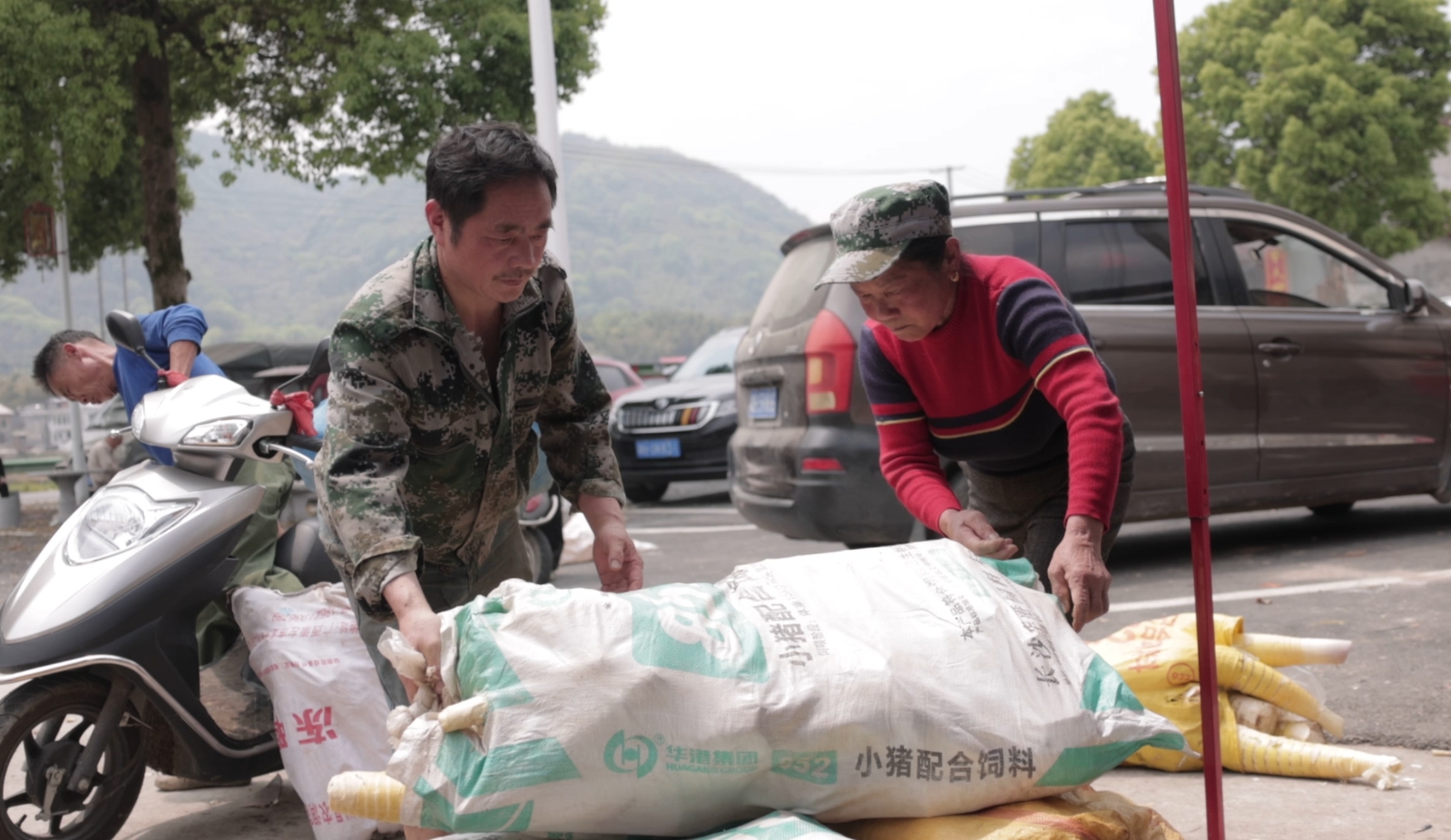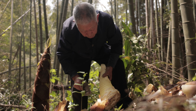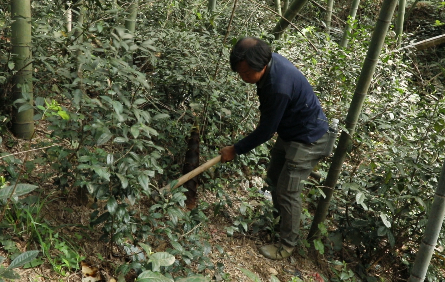 在该村龙兴庵山的笋竹两用林里,村民袁子清挥动锄头精准定位破土而出的春笋,82岁的叔叔袁建明则熟练地去根、剥壳、装袋。这对叔侄搭档采笋已经有五个年头了,平均每天可采收鲜笋600余斤。“现在是黄金采收期,按当前每斤1元的收购价,20天采收期能增收上万元。”袁子清擦着汗笑道。这些刚从竹林采收的新鲜春笋,将会被统一装车,送往村上的楠山竹笋专业合作社进行集中收购。