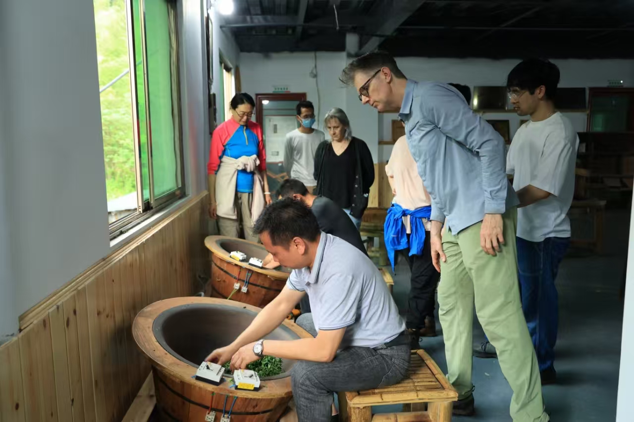 在茶场的炒茶车间,外国游客亲眼见证了传统炒茶技艺的全过程,并亲手尝试。随着锅温的逐渐升高,茶叶在锅中翻滚跳跃,散发出阵阵清香。他们在专业师傅的指导下,学习如何掌控火候、翻炒茶叶,感受着茶叶从鲜叶到成品的奇妙变化。来自北京的吴建丽女士一直从事生活茶道的推广和养生中国茶的研究,2008年奥运会期间,她入选北京市“奥运人家”,接待来京参观奥运的外国朋友,用茶香迎宾客,让更多的国际游客认识了中国茶这一传统瑰宝。她也是这次活动的策划者。“我是通过看到文旅宣传片受它吸引来到的这里。当我来到这里之后,我发现它比宣传片更加美。甘泉山茶场的茶我今天喝了一天,真的非常非常香,我非常喜欢。这个地方非常适合有时间的朋友过来旅游、休闲、饮茶。”吴素丽说。