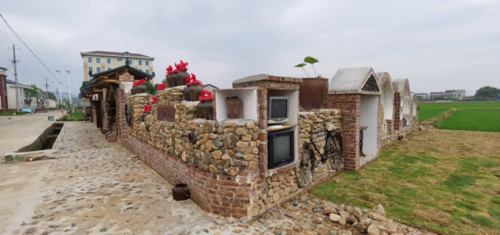 在渠道边还用红砖砌了一道长长的农耕文化长廊,将村民们捐赠的老物件镶嵌、悬挂在墙上。“这是70多岁的向芙蓉捐出珍藏的嫁妆缝纫机,这是60多岁的莫建明送来古老的打铁工具;这是乡友陈哲夫捐赠石桌、石磨等多种石器。”李谷云介绍,这些老物件承载着村民的奋斗史,更是对下一代的殷切期望。