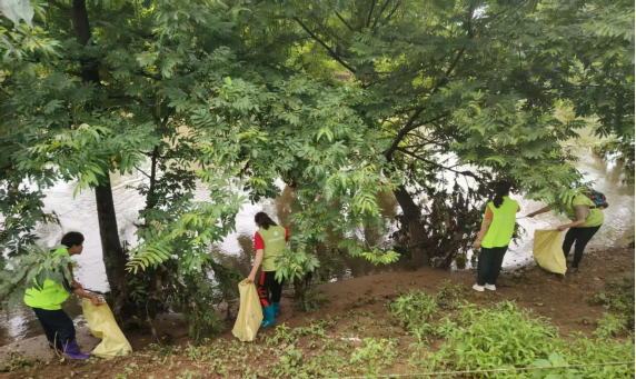 志愿者在清理河流沿岸散落垃圾 曾智峰 摄