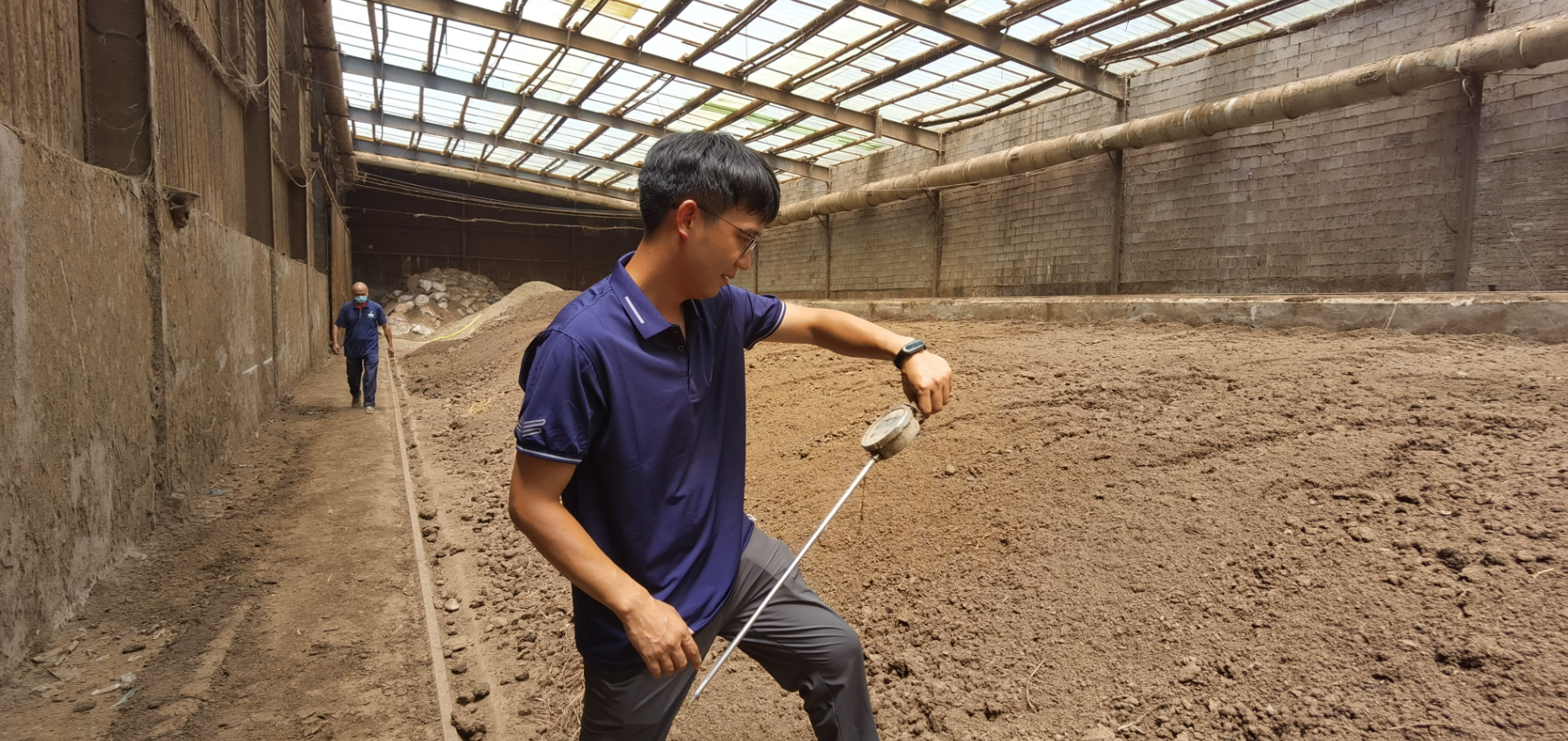 贺顺在测量发酵车间堆肥的发酵温度 胡卫红 摄