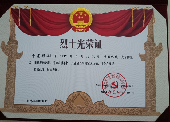 墓地修缮后,曾坚毅承担起一项更重要的任务:受将军之子曾仰之的郑重委托,为其父亲申请烈士身份。“我始终将此事放在心上,前后三次协助申请。最终在2024年9月30日,申请获得正式批复,由党和国家功勋荣誉表彰工作委员会办公室颁发了烈士证书。”