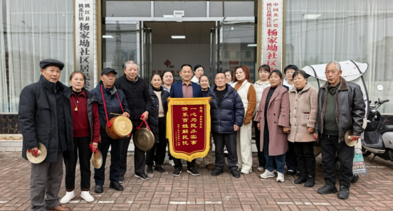 12月16日下午,桃花江镇杨家坳社区,原桃江县玻璃厂几位退休职工将一面印有“一心为民办实事 情系百姓解民忧”的锦旗送到社区支部书记潘伟长手中,感谢社区彻底解决了他们多年的用水难题。