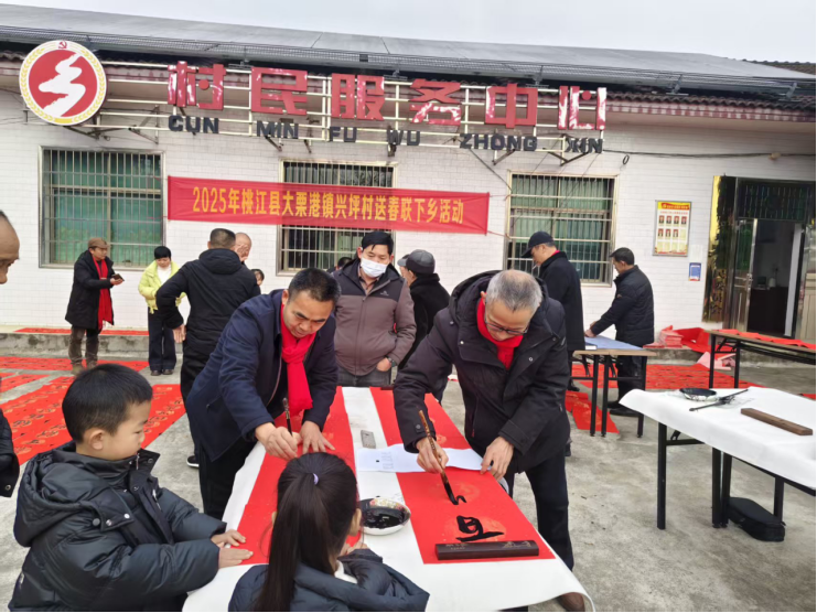春节前夕,大栗港镇兴坪村村民服务中心广场上热闹非凡,一场“送春联下乡”文化惠民活动正在开展。