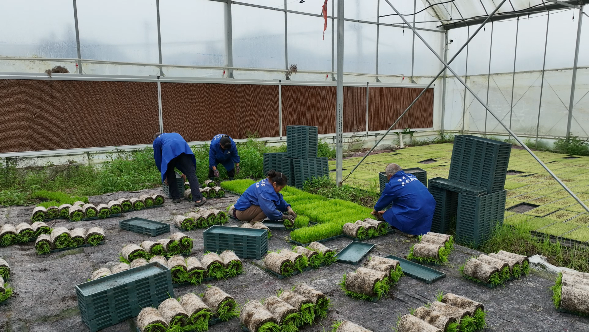 育秧中心内工作人员正在进行起秧 陈明 摄