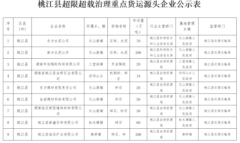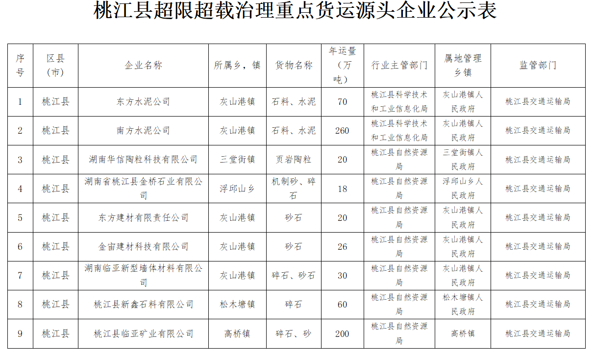 附件:《桃江县超限超载治理重点货运源头企业公示表》