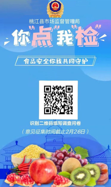 为进一步做好食品安全抽检工作,鼓励社会公众积极参与食品安全监管,充分发挥社会公众在食品安全监管中的参与和监督作用,营造食品安全社会共治共享格局。桃江县市场监督管理局开展“你点我检、服务惠民生”活动,广大市民可以致电0737-8821055或者点击上图“你点我检”图片识别二维码进行投票,我局将对投票前20名的食品品种进行监督抽检,并将检验结果第一时间在桃江县公众信息网进行公示公布。