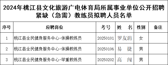 桃江县文化旅游广电体育局所属事业单位2024年公开招聘紧缺(急需)教练员拟聘人员公示