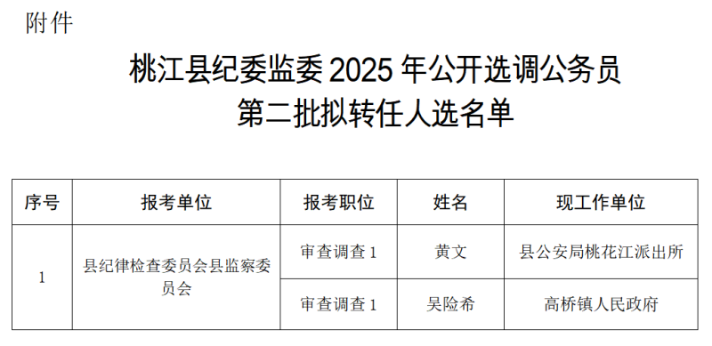 附件:桃江县纪委监委2025年公开选调公务员第二批拟转任人选名单
