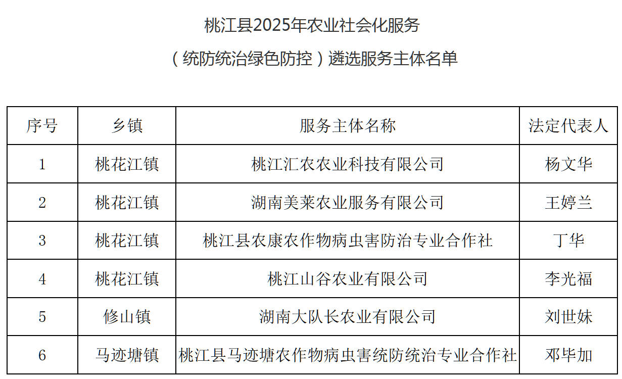 根据《湖南省农业农村厅 关于印发<湖南省2025年农业社会化服务实施方案>的通知》(湘农发〔2025〕46号)《桃江县2025年农业社会化服务(秸秆综合利用及统防统治绿色防控)实施方案》文件精神,经服务组织自主申报、联合考评、站党组审议通过,现将2025年统防统治绿色防控社会化服务遴选服务主体名单予以公示。公示期为5个工作日,对公示名单有异议的,请于公示期内向县农村经济经营服务站提交有关证明材料,联系电话:0737—8822816。