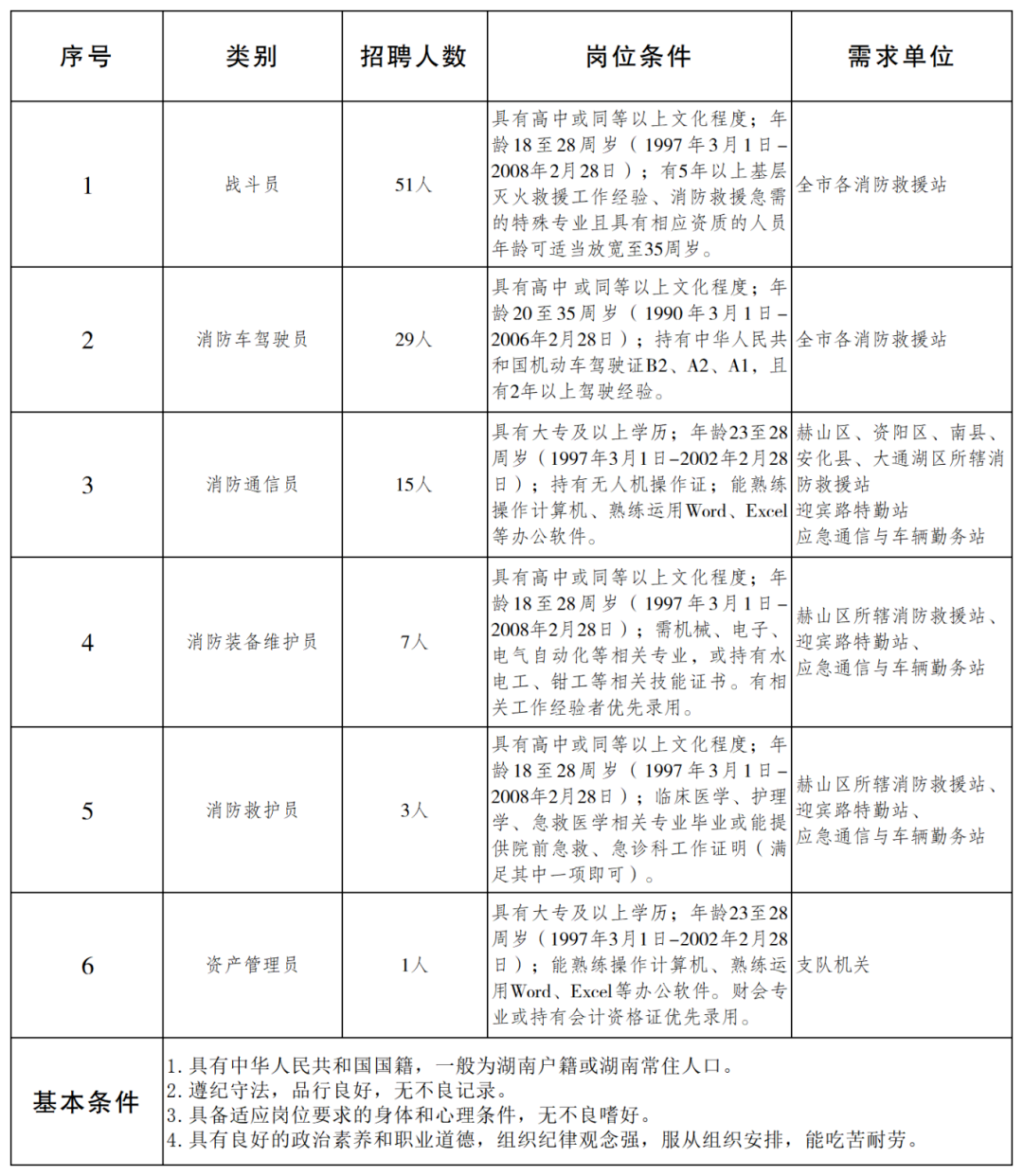 (五)消防救护员岗位3名,主要随队生活、训练、作战,并提供紧急医疗救护工作。