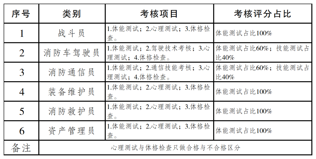 消防车驾驶员岗位。体能测试项目:1000米跑(具体标准详见附件3),考核成绩达不到最低标准的视为“不合格”,予以淘汰;驾驶技术考核项目:道路驾驶、倒车入库、侧方位停车等科目的技能考核,不合格的予以淘汰。