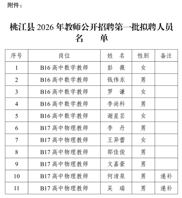 附件(见全文下方):桃江县2026年教师公开招聘第一批拟聘人员名单
