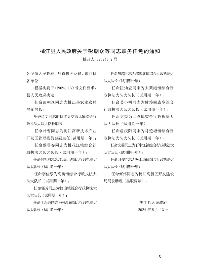 桃江县人民政府关于彭朝众等同志职务任免的通知