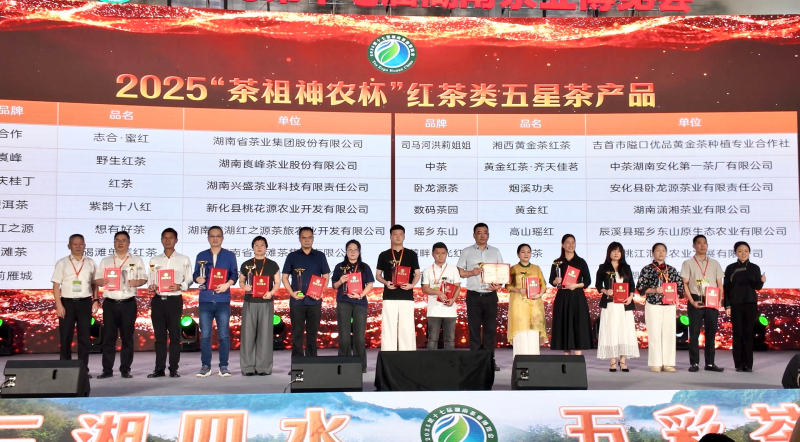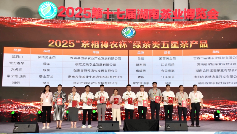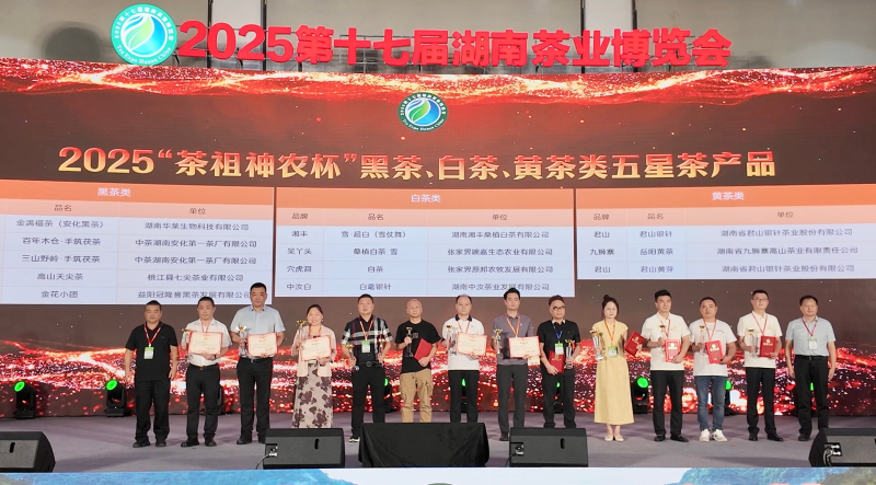 当天,活动还宣布了2025第十七届湖南茶业博览会“茶祖神农杯”五星茶产品暨优秀组织奖名单。其中,县农业农村局获评优秀组织奖,桃江汇泉农业发展有限公司壹方春早绿茶、麓畔宁光红红茶分别获评绿茶、红茶类五星茶产品,桃江县七尖茶业有限公司老木盆高山红茶、桃花湖七尖高山天尖茶分别获评红茶、黑茶类五星茶产品。