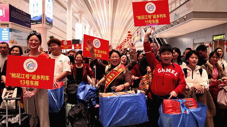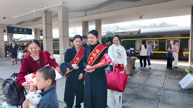 据了解,为了保障“桃花江”专列顺利开行,铁路部门开辟了专用通道和候车区域外,桃江县相关部门和广州市湖南桃江商会的志愿者也积极参与:提前做好了车厢的家乡文旅元素的装扮,协助搬运行李、引导客流,开展旅程温情互动,免费发放修山面、竹海幻境文旅消费代金券,抵达益阳站后,更贴心地为乡友递上热腾腾的擂茶,接站志愿者安排5台公交班车到站接送,真正让乡友一路“暖”回家。
